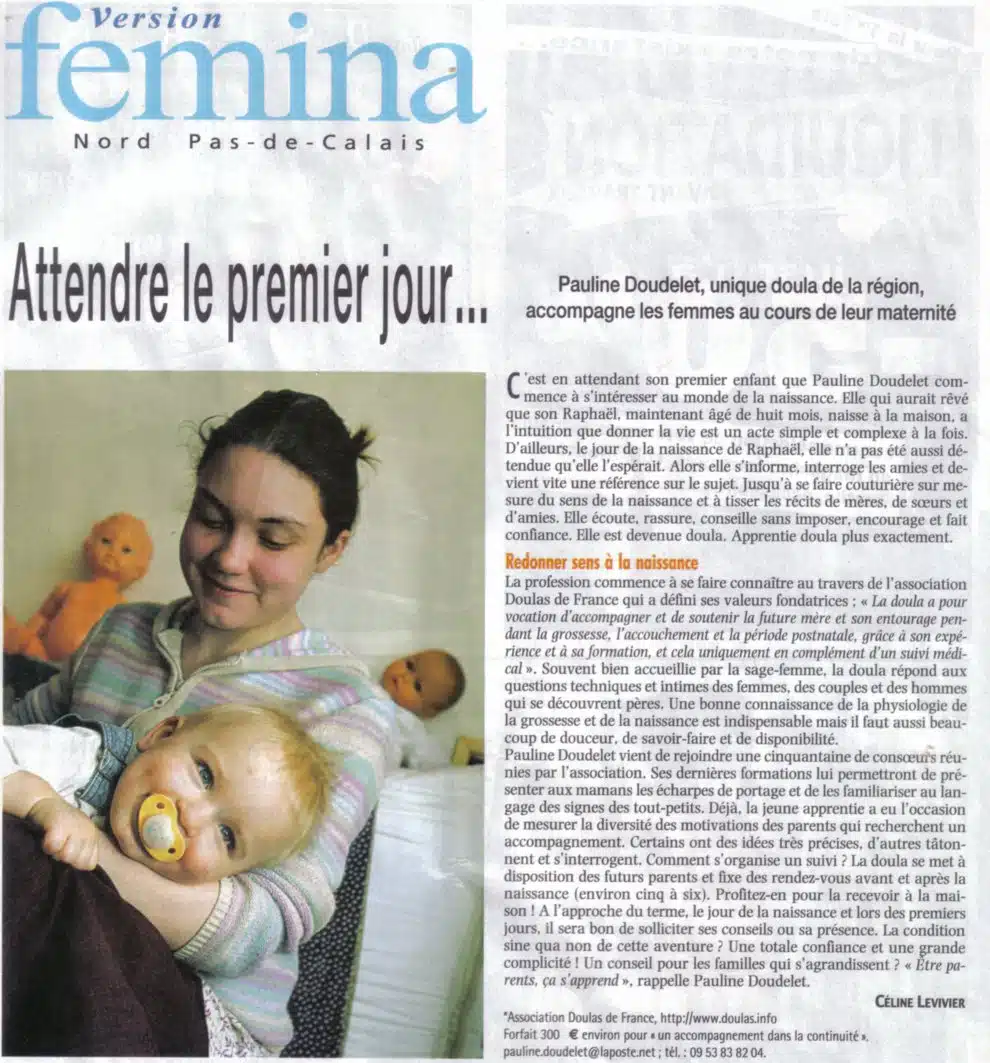 Femina Nord Pas de Calais, 2 mai 2007 Pauline Doudelet, unique doula de la région, accompagne les femmes au cours de leur maternité. Read more articles Article précédentLa doula, un accompagnement affectif de la maternité Article suivantLe phénomène des doulas Vous devriez également aimer Rencontre avec Nelly Michaud, doula 30 septembre 2019 Sintija, doula en Finlande 14 février 2019 Un accompagnement à la naissance avec une doula 20 mars 2015 France Bleu Herault, Les P’tits Loups 19 juin 2007 Tu enfanteras avec la doula 23 août 2007 Et si vous vous faisiez chouchouter par une doula du début de votre grossesse à l’arrivée du bébé 1 octobre 2009