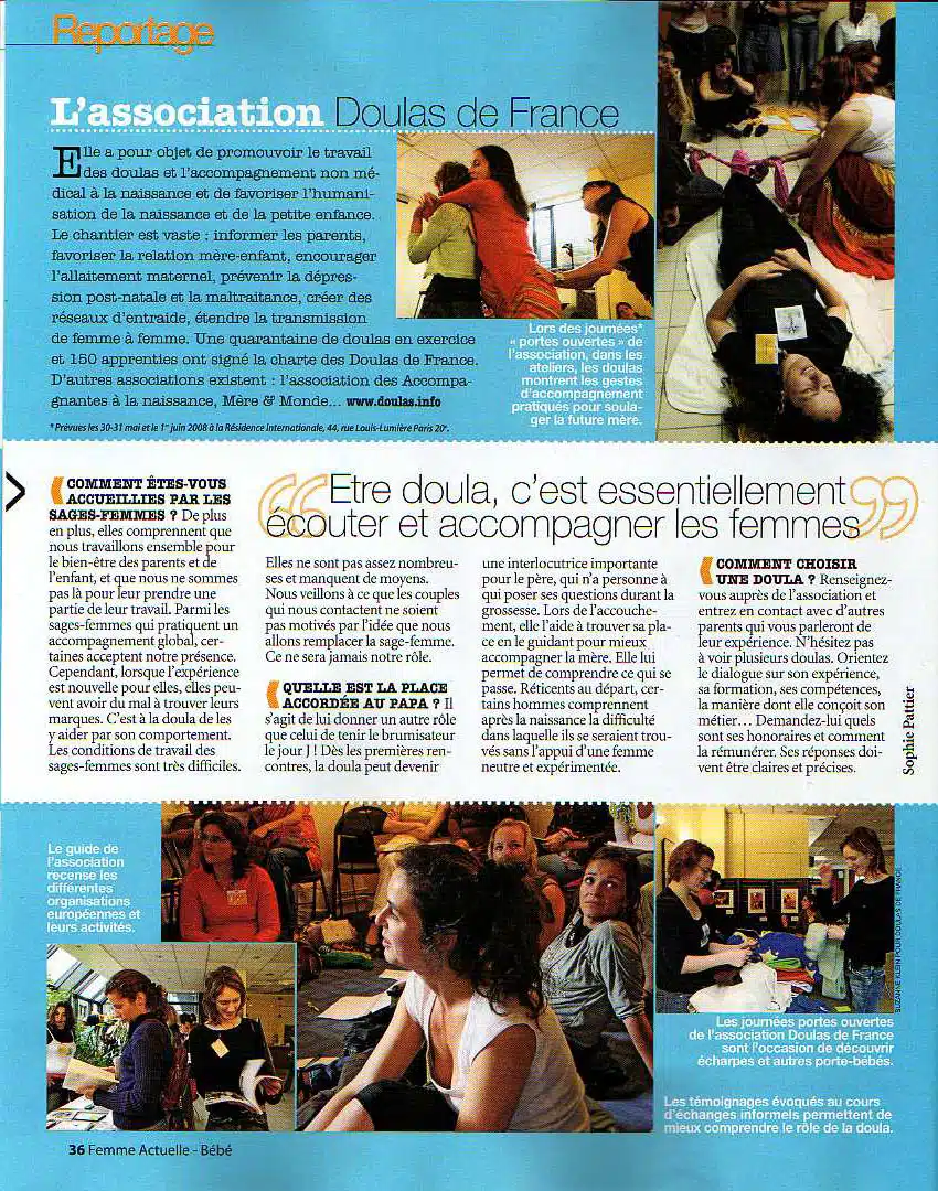 Femme Actuelle Hors Série Bébé, février 2008 Son rôle ? Accompagner la femme pendant sa grossesse. Zoom sur un métier encore méconnu en France. Read more articles Article précédent3 questions à… Valérie Dupin Article suivantEt si on revenait aux bonnes vieilles méthodes ? Vous devriez également aimer Qu’est-ce qu’une accompagnante à la naissance? 1 septembre 2004 Ma doula bien-aimée 1 décembre 2012 Accompagnement de la grossesse 6 juin 2019 L’accompagnement lors de l’accouchement et le rôle de la doula 1 janvier 2004 Grossesse : Quel est le rôle d’une doula ? 13 mars 2013 Les doulas 24 août 2007