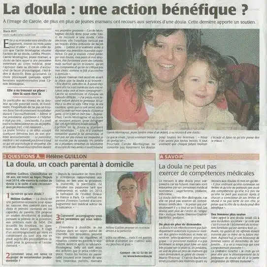 Courrier de l’Ouest, 16 août 2014 A l’image de Carole, de plus en plus de jeunes mamans ont recours aux services d’une doula. Cette dernière apporte un soutien… Read more articles Article précédentUne doula késako ? Article suivantAccouchement – maternité : être accompagné d’une doula Vous devriez également aimer So Cocoon, un voyage autour de la naissance 1 mars 2017 Préparation à la naissance et à la parentalité : au taquet pour accueillir Bébé ! 31 juillet 2023 Une doula pour embellir votre grossesse 1 juillet 2006 Une journée avec une doula 2 mai 2023 Doula ? Pourquoi pas vous ? 23 novembre 2012 Le papa, la maman et la doula 26 mai 2005